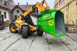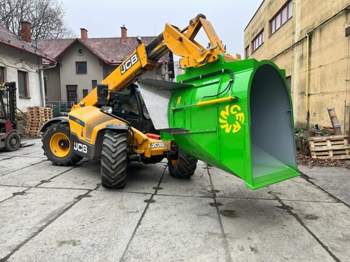 For smaller farms, the front-mounted feeding and bedding bucket MODEL NP—with a capacity of up to 6 m³—is also available.